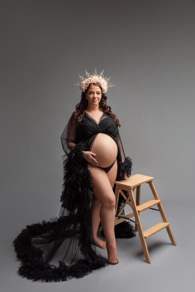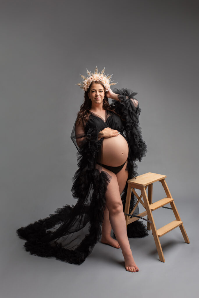 2. Modern Noir & Drama For a bolder look, we transitioned to a sophisticated slate gray backdrop. Mary donned a breathtaking black ruffled robe and a celestial-inspired floral crown. This “Queen” aesthetic is always a favorite—it’s powerful, chic, and celebrates the strength of motherhood. Rich joined her for several portraits here, his charcoal grey shirt perfectly coordinating with the moody, high-fashion vibe of the set.